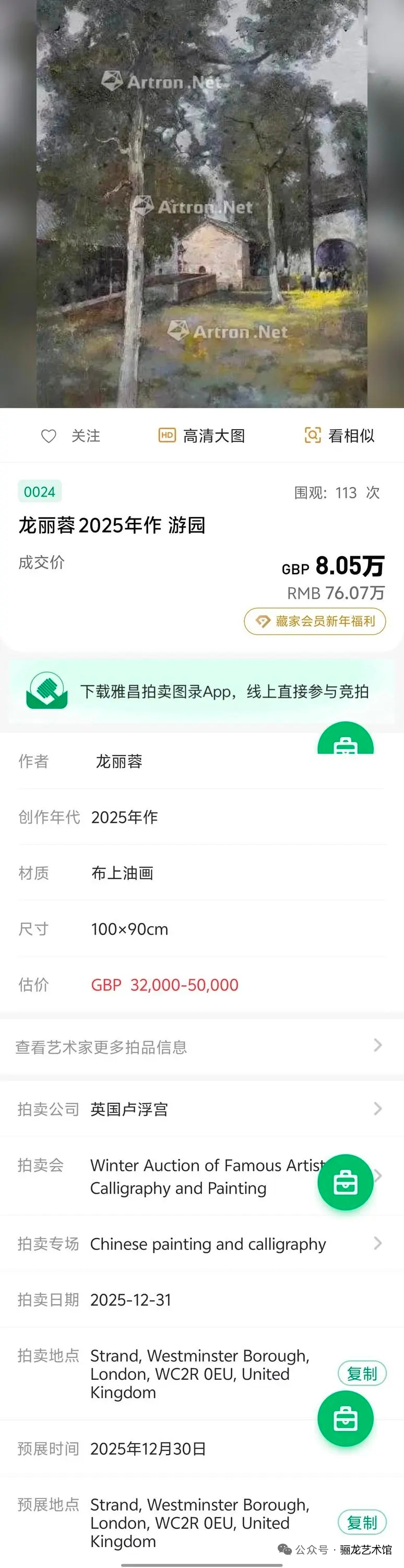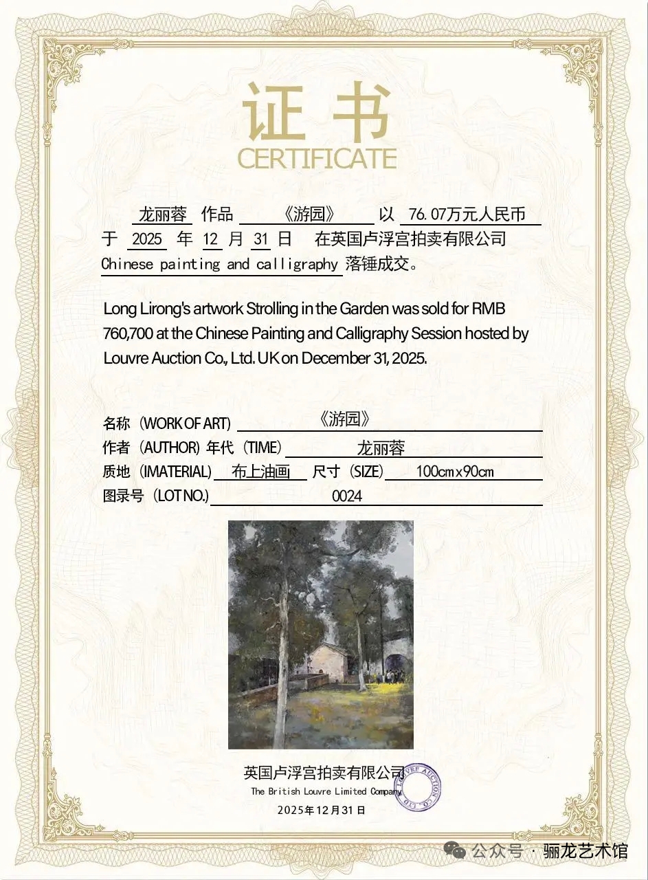在展览屡获佳绩的同时,龙丽蓉的艺术价值也获得国际市场的高度认可。2025年12月31日,其2025年创作的布上油画《游园》(100×90cm)在英国卢浮宫拍卖有限公司举办的“Winter Auction of Famous Artist Calligraphy and Painting”专场中,以8.05万英镑(约合人民币76.07万元)的价格成功落槌成交,远超3.2万至5万英镑的预估价,成为其艺术生涯中又一重要里程碑。